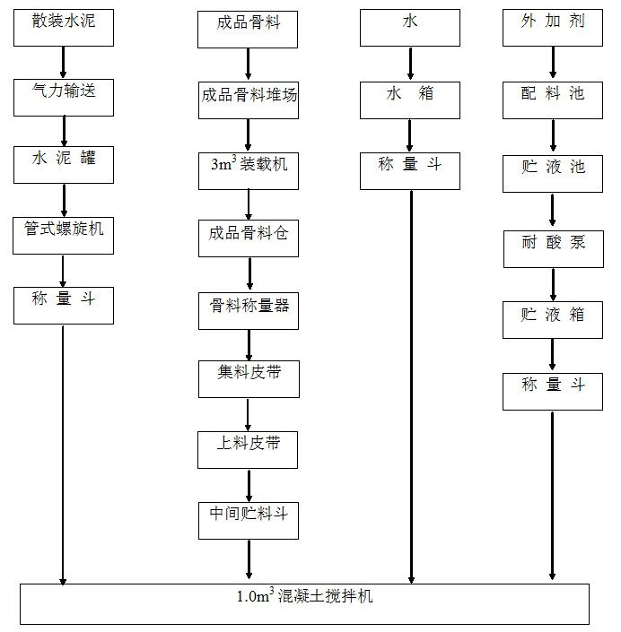 50型攪拌站分為四個(gè)部分:砂石給料、粉料(水泥、粉煤灰、膨脹劑等) 給料、水與外加劑給料、傳輸攪拌與存儲(chǔ)。其工作流程與這四個(gè)部分有關(guān)。具體如下圖所示: